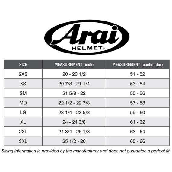 Tips: Mål hodeomkretsen med målebånd ca. 2 cm over øyenbrynene. Ligger du mellom to størrelser, anbefales det normalt å velge den minste for best passform, i tråd med Arais relativt faste innvendige passform.