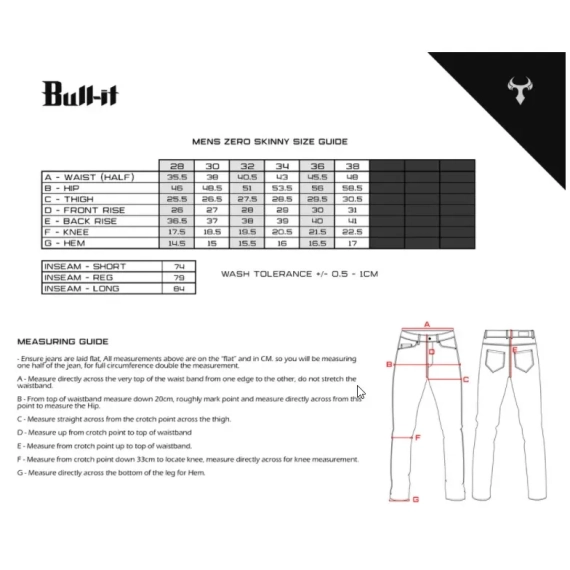Bull-It Zero har 4-veis stretch denim og er et enkeltlags-denim utviklet av Bull-it. Zero er testet i henhold til CE EN17092, og gir høy ytelse, lett design og overlegen komfort med 4 -veis fleksibilitet og AA -slitestyrke gjennom hele bukse-konstruksjonen.