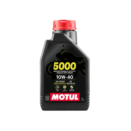 Motul 5000 10W-40 4T er en premium semisyntetisk 4-takts motorolje, blandet for flerbruksbruk, i on- og offroad-applikasjoner. HC-Tech® teknologi baseoljer og additiver gir utmerket beskyttelse mot slitasje på motor- og girkomponenter. Avansert JASO-godkjent formulering gir overlegen clutchadferd og motorrenslighet. Kompatibel med motorer utstyrt med utstyr for etterbehandling av eksosgass.