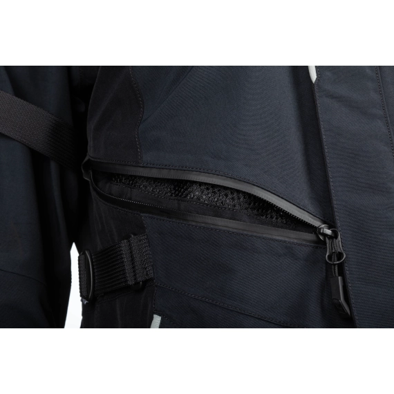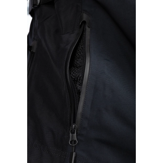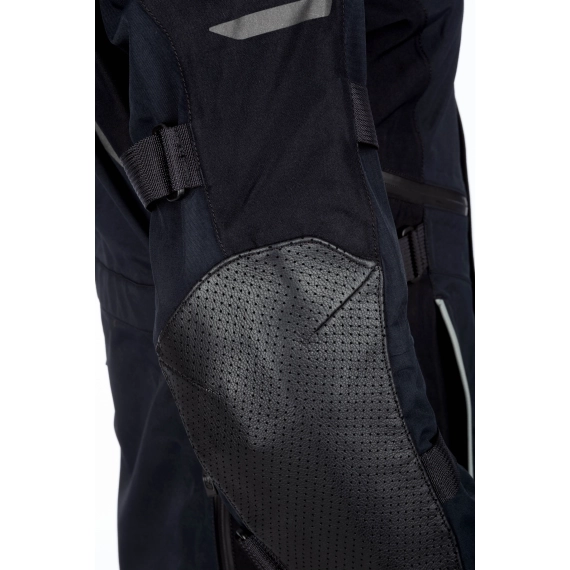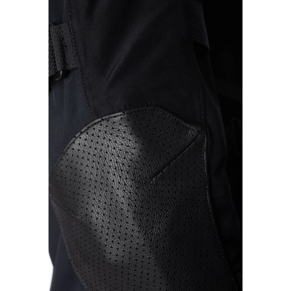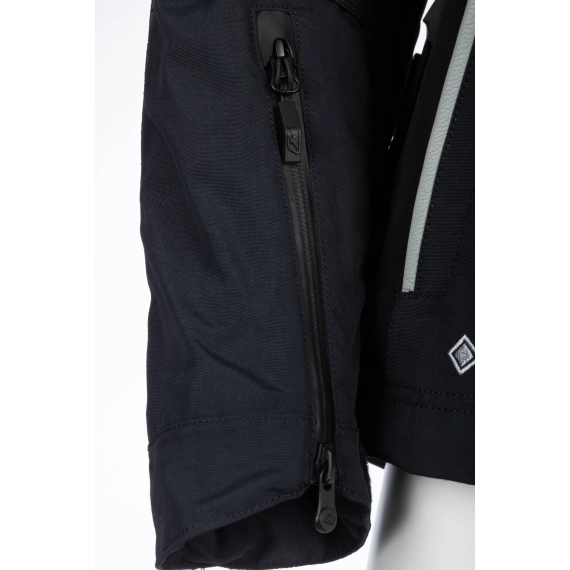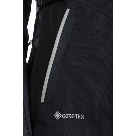 Ytterkonstruksjonen er bygget med GORE-TEX Performance Shell, som gir permanent vind- og vanntetthet samtidig som jakken puster godt under lange kjøreetapper. Jakken er sertifisert etter CE AA, EN 17092-3, og er konstruert med ekstra slitesterke soner der belastningen er størst. Skuldrene er forsterket med 600D Cordura®, mens albuene har perforerte paneler i geiteskinn for økt slitestyrke og bedre holdbarhet.