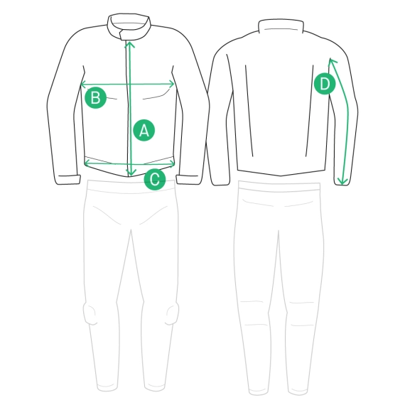 | Størrelse | A (Lengde) | B (Brystvidde) | C (Midjevidde) | D (Ermelengde) | E |